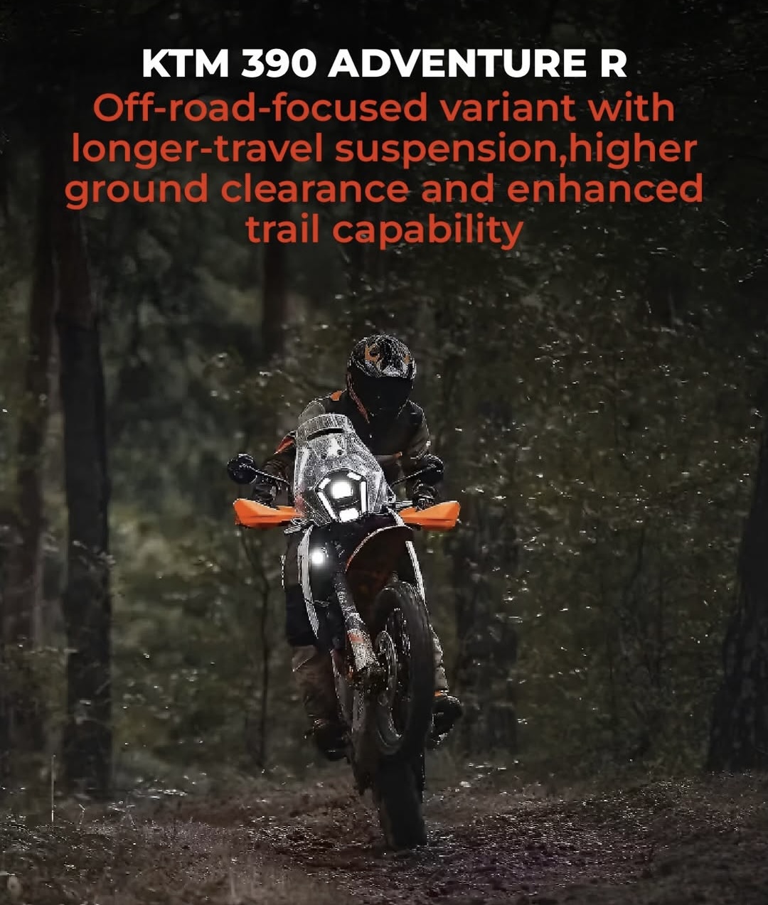 KTM 390 Adventure R un riders ke liye hogi jo serious off-roading chahte hain. Ye standard 390 Adventure se zyada rugged aur trail-focused hogi.